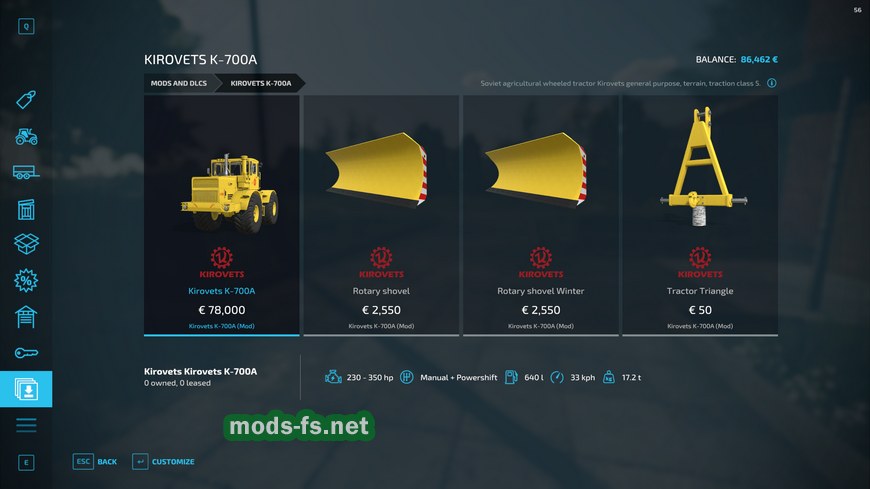 Кировец K-700A/К-701 для ФС 22. Характеристики: