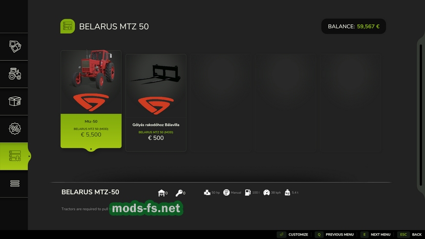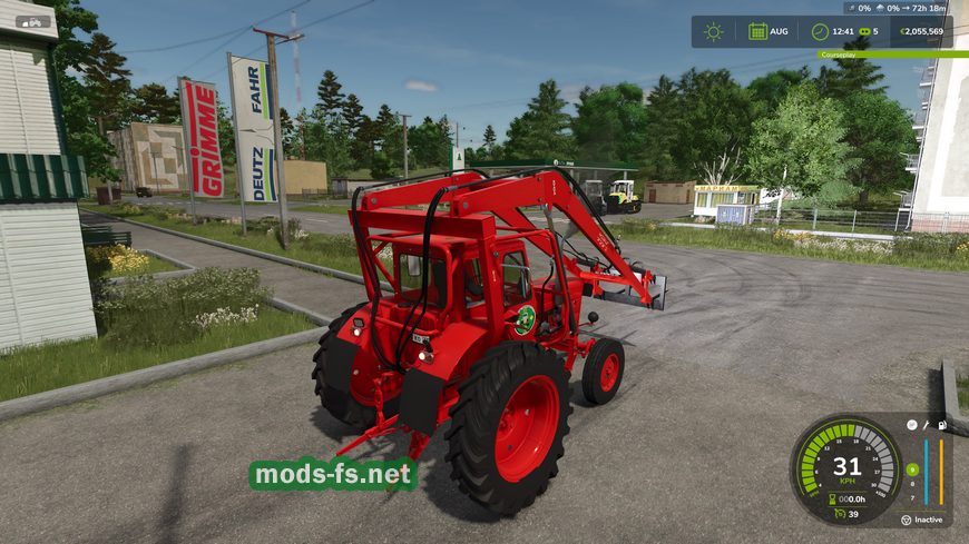 MTZ 50 with stork loader для ФС 25.  Верните старые времена на свою ферму с этим легендарным набором! В комплект входит классический трактор MTZ 50, оснащенный задним погрузчиком, так называемым «аистом». В набор также входит специальная вилка для тюков, поэтому перемещение тюков не представляет проблемы даже на сложной местности. Идеальный выбор для небольших ферм или любителей ностальгии.