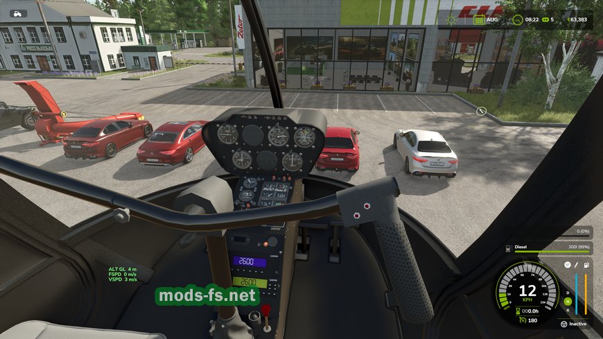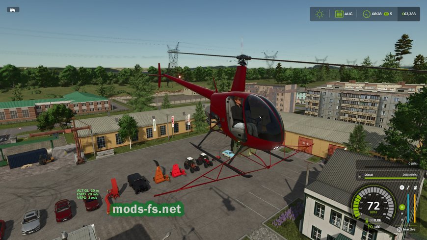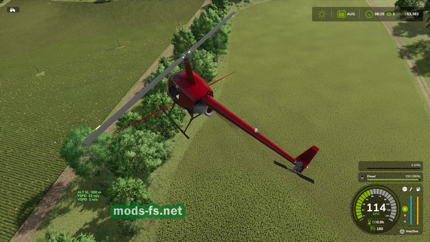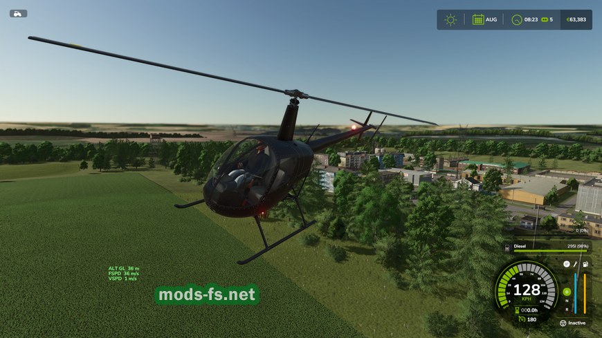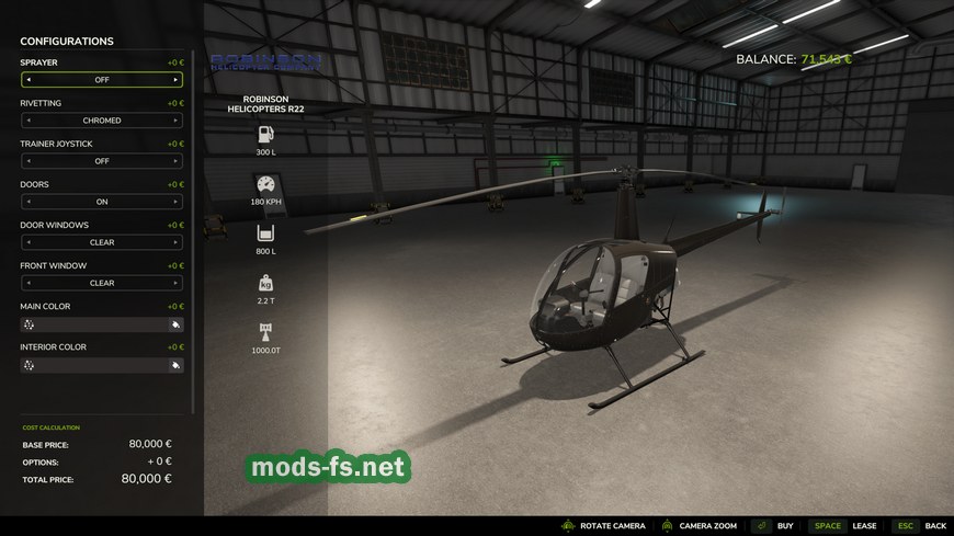 R22 оснащен рабочей системой опрыскивания с рабочей шириной 50 м, что делает его идеальным для обработки посевов или просто для добавления немного ролевой игры в вашу фермерскую деятельность. Он также включает в себя функциональный грузовой крюк, дающий вам возможность поднимать и перемещать объекты с воздуха для дополнительной полезности. Навигационные и стробоскопические огни полностью работоспособны, что помогает оживить вертолет, особенно во время вечерних полетов.